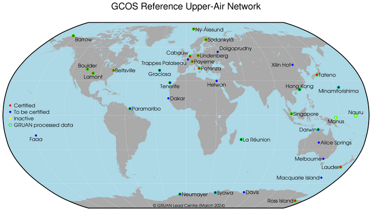 GRUAN, to the extent possible, builds on existing observational networks and capabilities, including those of NDACC. It currently consists of 33 selected sites in various climate zones, and is represented with at least one site on each continent. The aim is to establish additional sites in Africa, South America and the central Pacific.