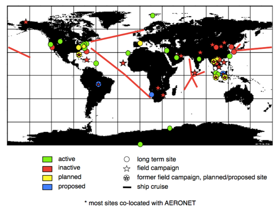 The NASA Micro Pulse Lidar Network (MPLNET) [Welton et al., 2001] is a ground based network of Micro Pulse Lidar (MPL) [Spinhirne et al., 1995] instruments collocated with sun photometers in the NASA Aerosol Robotic Network (AERONET) [Holben et al., 1998]. MPLNET and AERONET are federated networks of instruments designed to collect aerosol and cloud data using standardized data processing algorithms and a central archive and distribution system. MPLNET data provide information on the vertical distribution and properties of aerosol and cloud layers. MPLNET instrument calibrations and Level 1 signal processing algorithms are described by Campbell et al. [2002] and Welton and Campbell [2002]. Level 1 data are acquired at 1-minute temporal and 75-meter vertical resolutions. MPLNET data products also include near-real-time (no quality assurance) Level 1.5 data and final-quality-assured Level 2 data containing layer heights and aerosol properties. The planetary boundary layer height and aerosol top height products are discussed in Lewis et al. [2013] and Campbell et al. [2003], respectively. Thick low cloud heights are determined from derivatives of the Level 1 signal, and high cloud heights are based on Campbell et al. [2008]. The temporal resolutions of the layer products are: cloud (1 minute), PBL (5 minutes), and aerosol (20 minutes). Aerosol products also include profiles of aerosol backscatter, extinction, and aerosol optical depth (AOD), and the column aerosol lidar ratio. Aerosol products are derived using 20-minute, cloud-screened Level 1 III-14 profiles centered on AERONET AOD observation times. The AERONET AOD is used to constrain the retrieval of the aerosol backscatter profile, and compute a final lidar ratio [Welton et al., 2000]. Quality-assured Level 2 MPLNET aerosol products are generated using Level 2 AERONET AOD, profiles of molecular backscatter derived from air density provided by NCEP reanalysis, and the following data screening standards: MPL instrument temperature within 2˚ C of the original optical alignment temperature, a minimum of 16 cloud-free signal profiles during the 20-minute signal average (80%), and derived lidar ratio errors less than 30%. MPLNET Level 2 aerosol products have been validated numerous times. The most recent and comprehensive validation was presented in Schmid et al. [2006], concluding MPLNET Level 2 aerosol extinction profile accuracy within 20%. MPLNET data and more information on the project are available at the MPLNET website.