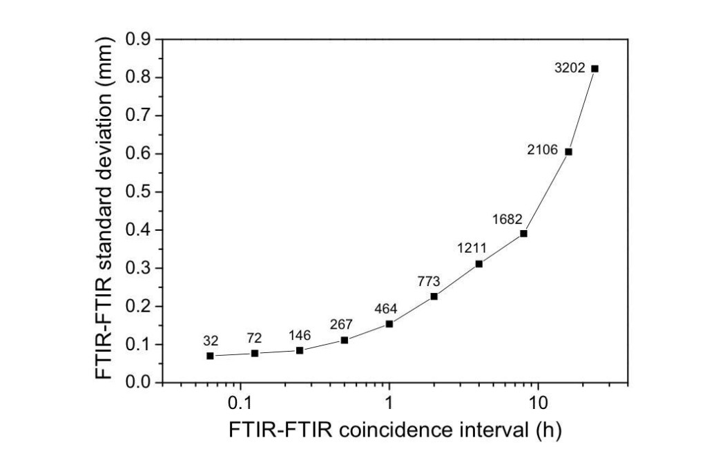 Figure 1. (After Sussmann 2009) Standard deviation of IWV in mm H2O vs observation coincidence interval for two co-located FTIR instruments. The point numbers are the number of coincident observations.