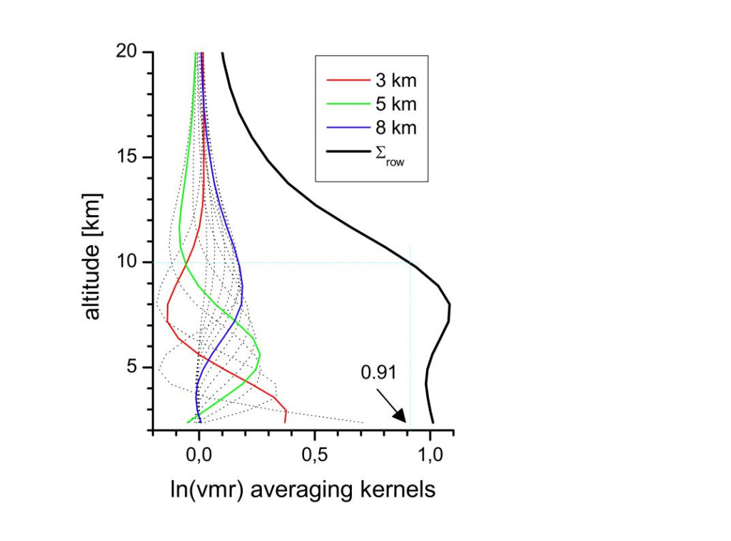 Figure 2. (After Schneider 2010) Typical averaging kernels for ground-based FTIR remote sensing of watwer vapor. Kernels for 3, 5 and 8km are highlighted in red, green and blue respectively and the sensitivity in black.