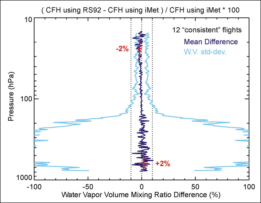 Comparisons of the balloon-borne measurements showed small, but non negligible differences in the derivation of water vapor mixing ratio profiles by the frost-point hygrometers depending on the radiosonde pressure and temperature information used. The typical 0.5 K and 0.5 hPa differences observed between the Vaisala RS92 and Intermet-1 radiosondes measurements resulted in the mean frost-point-derived mixing ratio difference shown in Fig. 1 (from the 12 most stable CFH flights of the campaign).