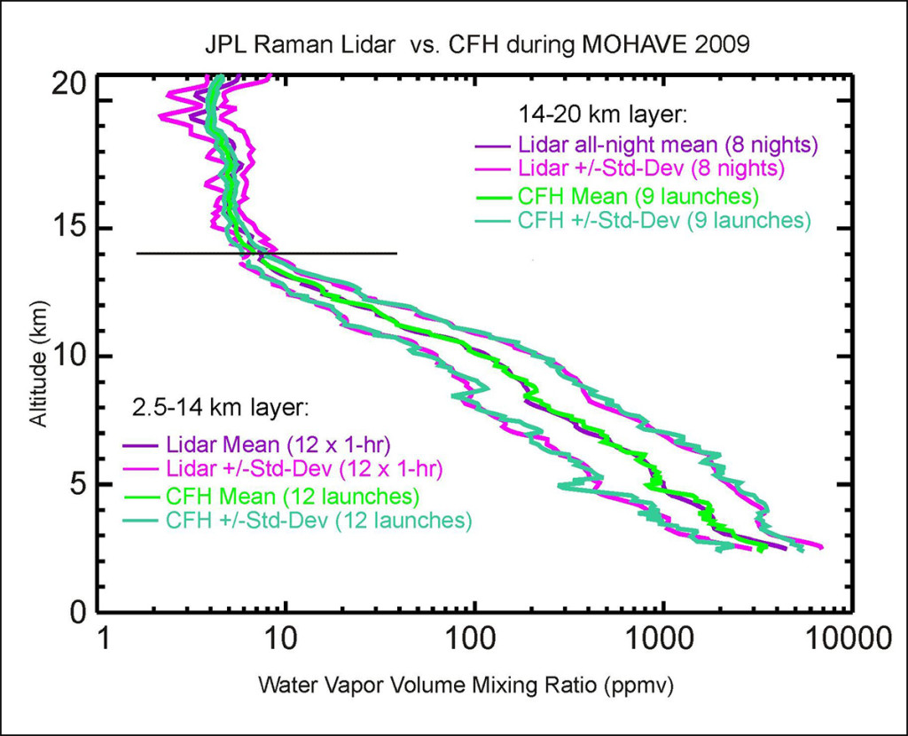 Over 270 hours of water vapor nighttime measurements from three of the four Raman lidars were compared to that from the radiosondes and Frost-Point hygrometer sondes. As shown in Fig. 2, excellent agreement between the JPL lidar and the CFH was found throughout the measurement range, with only a 3% (0.2 ppmv) mean wet bias for the lidar with respect to CFH in the upper troposphere and lower stratosphere (UTLS). The two other operating water vapor lidars provided satisfactory results in the lower troposphere, but suffered from contamination by fluorescence, preventing their use in the UTLS (wet bias ranging from 5 to 50% between 10 km and 15 km).