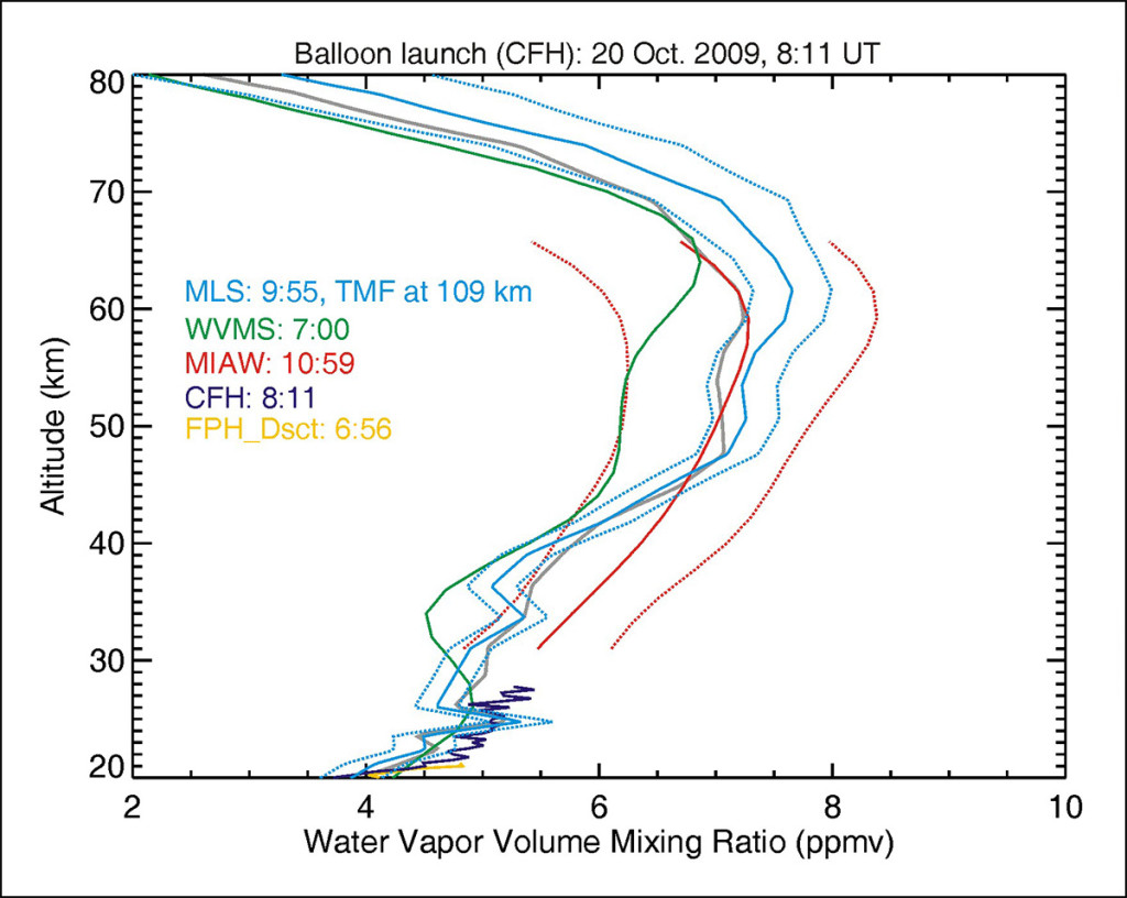 Comparisons were also made in the stratosphere and mesosphere between the WVMS radiometer, Aura-MLS, and the MIAWARA-C radiometer. A typical example of the measured profiles and their uncertainties is given in Fig. 3. Between 40 and 65 km, general agreement within 10% is found between all instruments. Below 40 km, MIAWARA-C was wetter than MLS, while throughout the stratosphere WVMS was generally drier than MLS. These discrepancies are currently under investigation. The numerous results from MOHAVE-2009 have shown the critical importance of such multi-techniques comparison campaigns. On one hand, they remind us that the measurements of water vapor in the UTLS remains a contemporary challenge. On the other hand, they provide new confidence in the future simultaneous detection by lidar of long-term variability of water vapor and ozone in the UTLS.