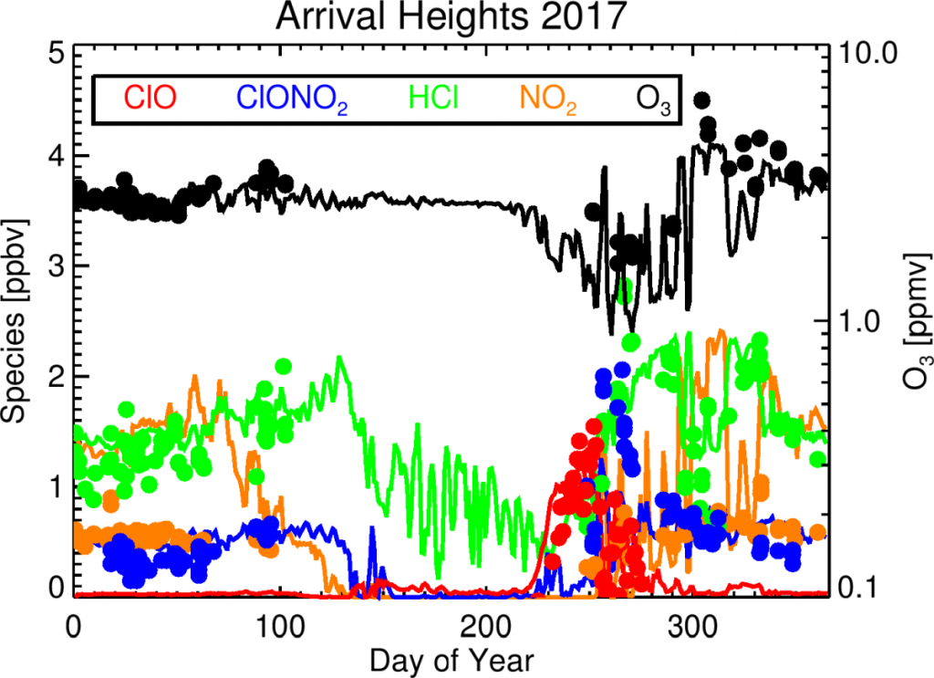 Ground based measurements (filled circles) and the GMI-MERRA2 simulation (lines) of ozone and other key species contributing to heterogeneous ozone destruction above Arrival Heights and Scott Base NDACC stations, Antarctica (77.82S,166.65E) in 2017. Ozone, HCl, NO2 and ClONO2 measurements are taken with a Fourier transform interferometer (FTIR), whereas the ClO measurements are made with a microwave radiometer. Constituent concentrations (ppbv or ppmv) are density weighted average volume mixing ratios over the altitude range 18-24 km (~73-35 hPa). Simulated species are shown for 12Z daily except for ClO, which is output at 0Z (midday at the stations’ longitude). All datasets (model and measurements) are available from the NDACC database. [Susan Strahan (NASA, USA), Dan Smale (NIWA,NZ),Gerald Nedoluha (NRL,USA)]