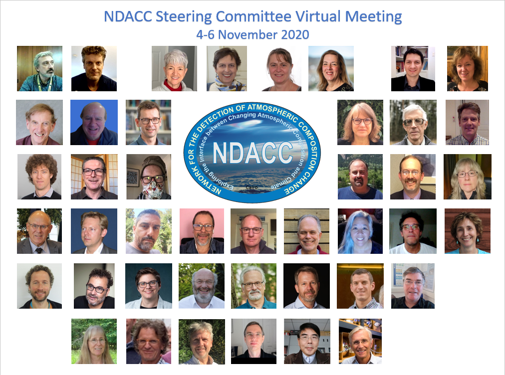 The NDACC Steering Committee held its annual meeting 4–6 November 2020. Originally scheduled to take place at the NOAA Center for Weather and Climate Prediction (NCWCP) in College Park, MD, the meeting was changed to a virtual format because of ongoing COVID-19 restrictions. The agenda was compressed into three short sessions, but attendees still were able to discuss a wide variety of topics, including station and data submission status, implementation of Digital Object Identifiers (DOIs), changes to the NDACC Data Protocol, the addition of Data Versioning options, new relationships with the European Centre for Medium-Range Weather Forecasts (ECMWF) Climate Data Store, and the Pandonia Global Network (PGN) Cooperating Network. The abbreviated meeting was considered to be a great success, with a significant number of members in attendance. Moving forward, the Steering Committee is hopeful for a return to an in-person meeting in September 2021.