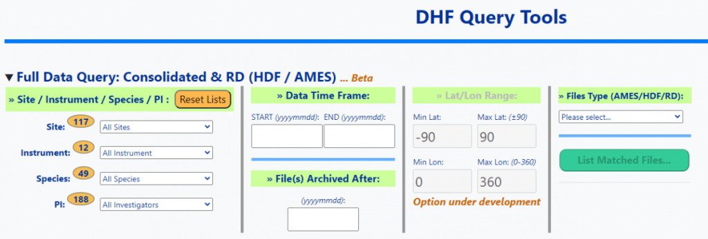 The NDACC DHF team announces its newest DHF Query Tool: Full Data Query. This tool is a robust search of the database using keywords from the NDACC database tables, and provides a list of matching files which can be selected to general a downloadable file containing the chosen data. This mimics one of the legacy DHF tools with the added benefit that it is available to the general public, whereas the legacy tool was restricted to NDACC data providers. Note the Full Data Query tool is in beta version. Soon to be added is a search based on latitude and longitude.