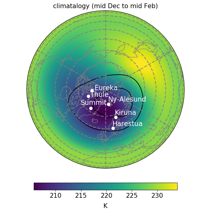 Fig 1. Map of station locations with climatological temperature at 10 hPa and EPV at the PT= 850 K during wintertime (DJF) over the Northern Hemisphere. The climatology is based on non-SSW years from 2004 to 2019. The map coloring shows the average winter temperature. The black contour lines are 600 and 800 EPV units (10−6 K m2 kg−1 s−1).
