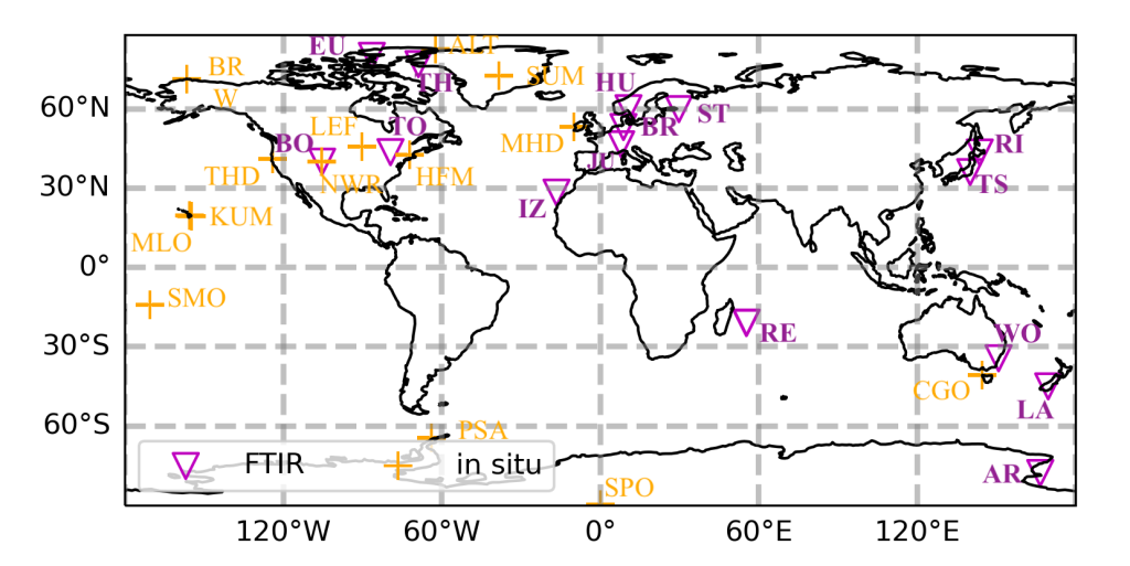 Figure 1. The location of the FTIR sites in this study as well as the NOAA in situ flask measurement sites.