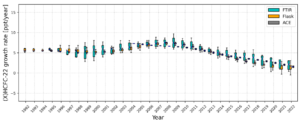 Figure 2. Box plot of the HCFC-22 annual growth rates derived from FTIR, co-located ACE-FTS satellite measurements, and all NOAA surface flask observations between 1992 and 2022.